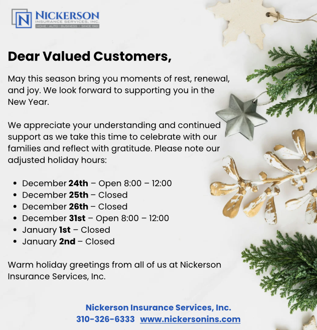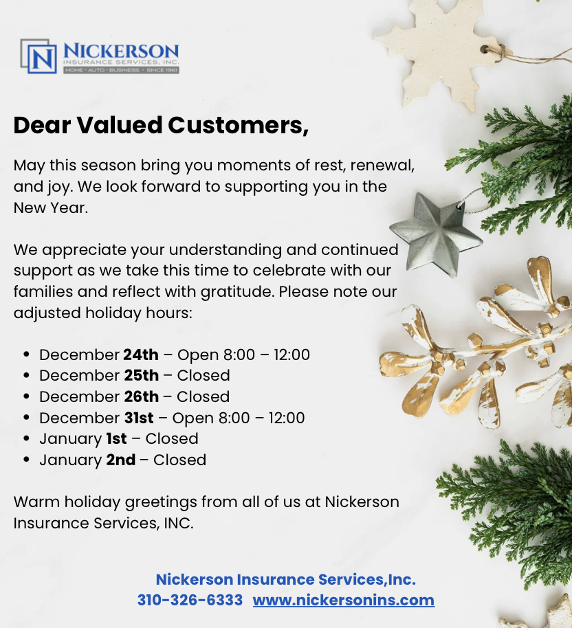 Nickerson Insurance Services, Inc. is a comprehensive insurance agency that has been providing personalized insurance coverage since 1961. From homeowners insurance to auto insurance, our goal is to provide you with complete coverage at a competitive price. Give us a call and speak with one of our dedicated customer service representatives. We are here for you.
